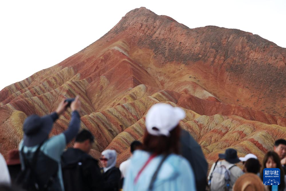 游客在張掖市七彩丹霞景區觀賞雨中丹霞(6月22日攝)。